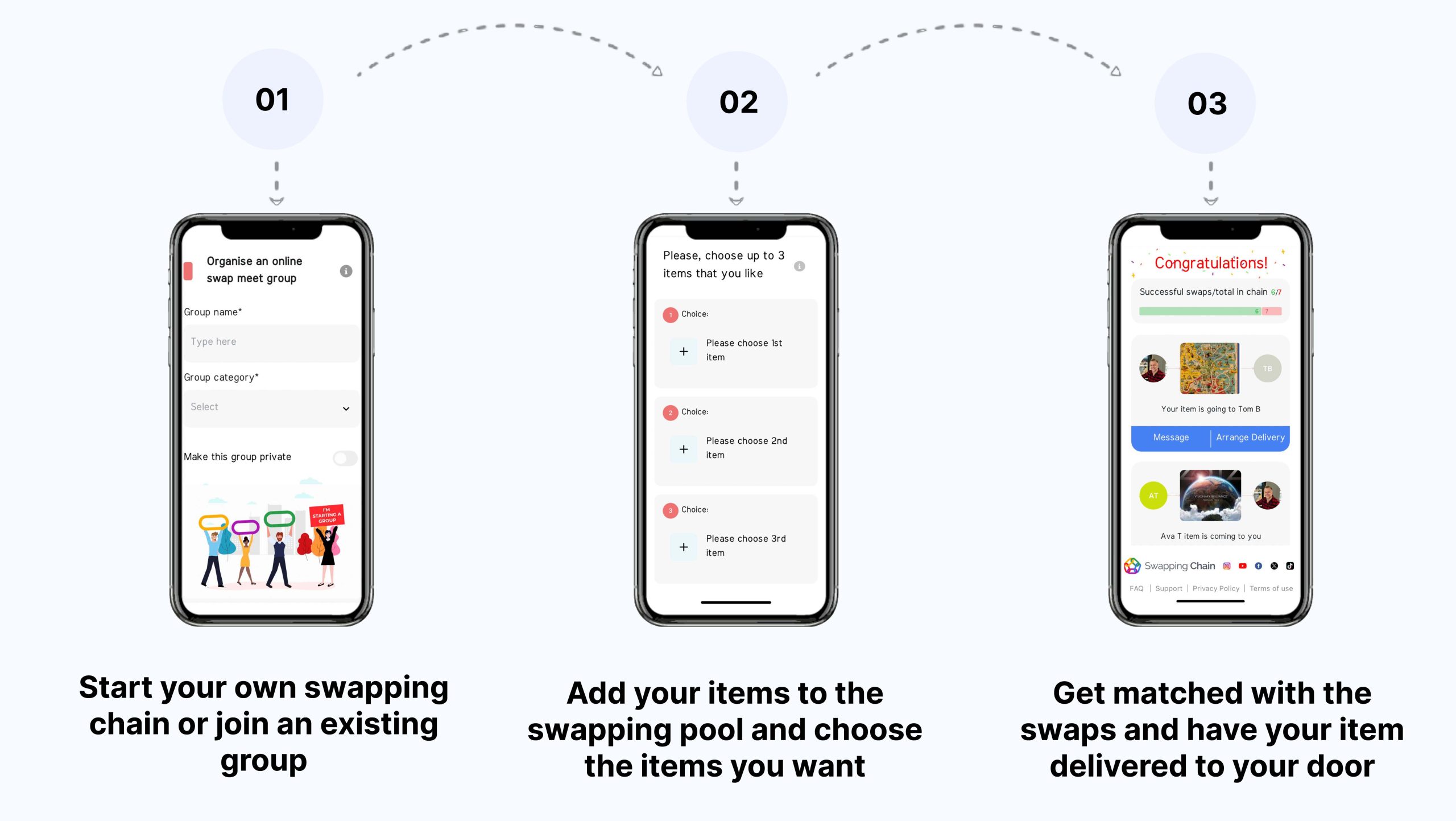 Join or start a group, and you will all place an item into the Swapping Chain. Your item goes to Mary, Mary’s item goes to John, John’s item to Sally, and so on until you get the item you chose. Let our app find your match and do its magic. Don’t buy, Swap!